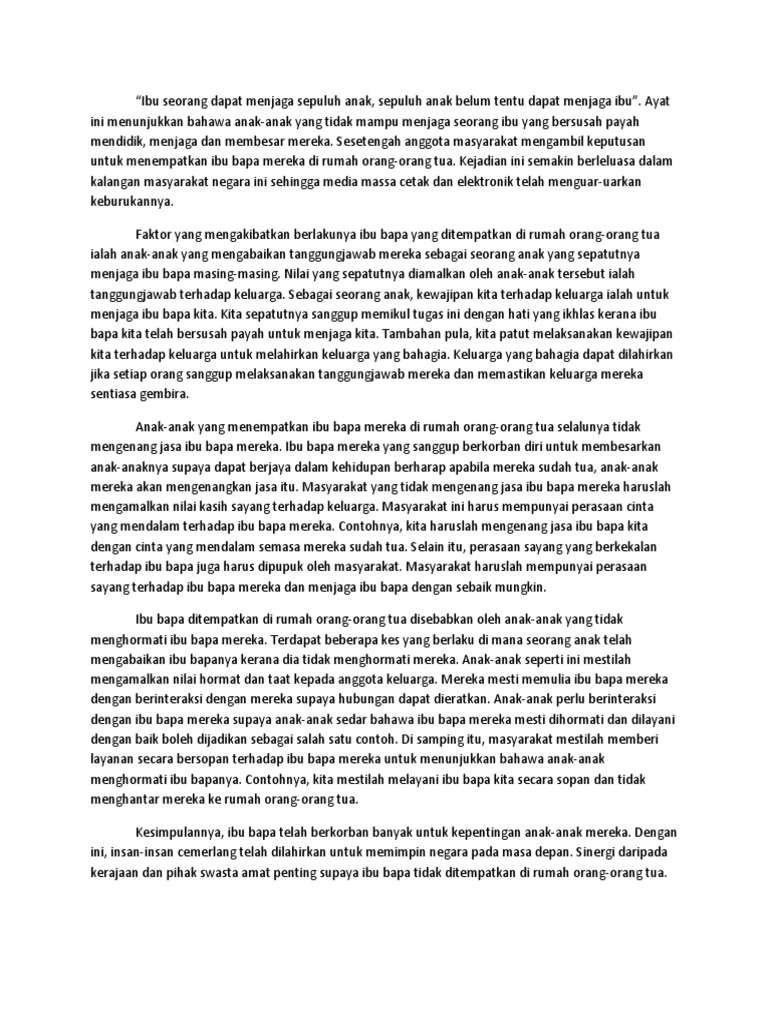 Situasi ini menyebabkan ada orang tua yang tidak menaruh sebarang kepercayaan bahawa anak mereka akan sanggup menjaga sakit pening mereka lantas sanggup tinggal di rumah orang-orang tua kerana lebih mempercayai orang lain untuk menjaga mereka daripada anak kandung mereka sendiri Noraini Che Sharif et. Ibu bapa saya telah berubat di klinik dan turut berjumpa pengamal perubatan islam. Tanpa ibu dan bapa kita takkan lahir ke dunia ini.